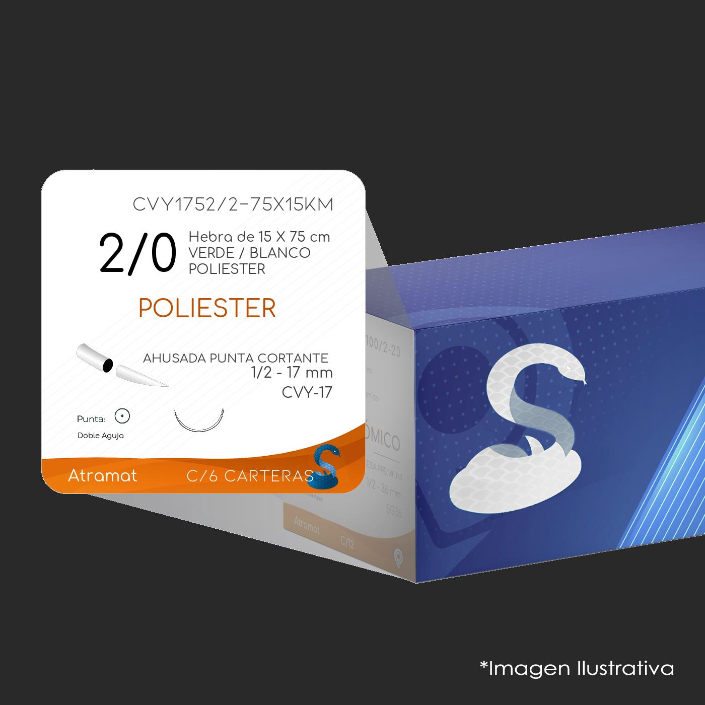 CVY1752/2-75X15KM POLIESTER 2/0 Aguja 1/2 – 17 mm Doble Aguja AHUSADA PUNTA CORTANTE CVY-17 Hebra de 15 X 75 cm Uso: Cardiología C/6 carteras. Marca: Atramat