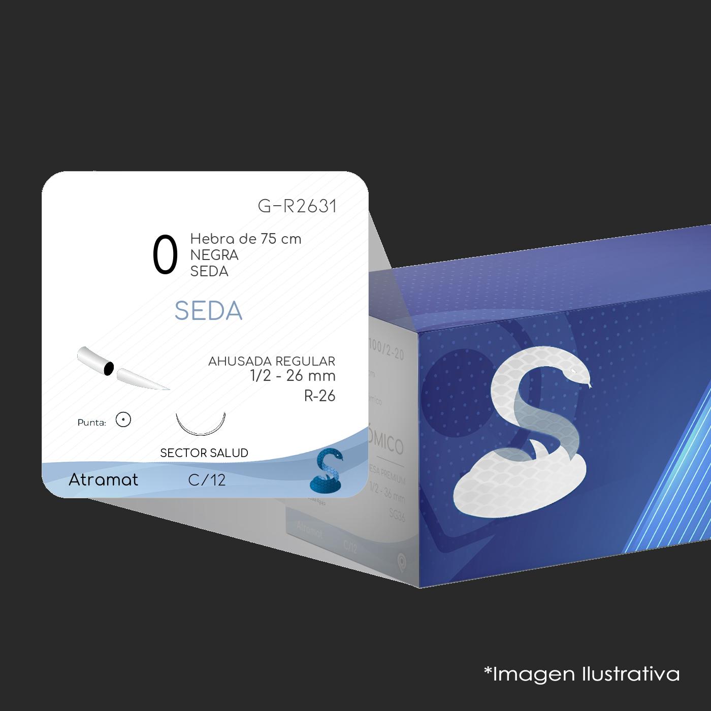 G-R2631 SEDA 0 Aguja 1/2 – 26 mm AHUSADA REGULAR R-26 Hebra de 75 cm Uso: Cirugía General, Gastroenterología, Oftalmología, Ginecología, Obstetricia C/12 . Marca: Atramat